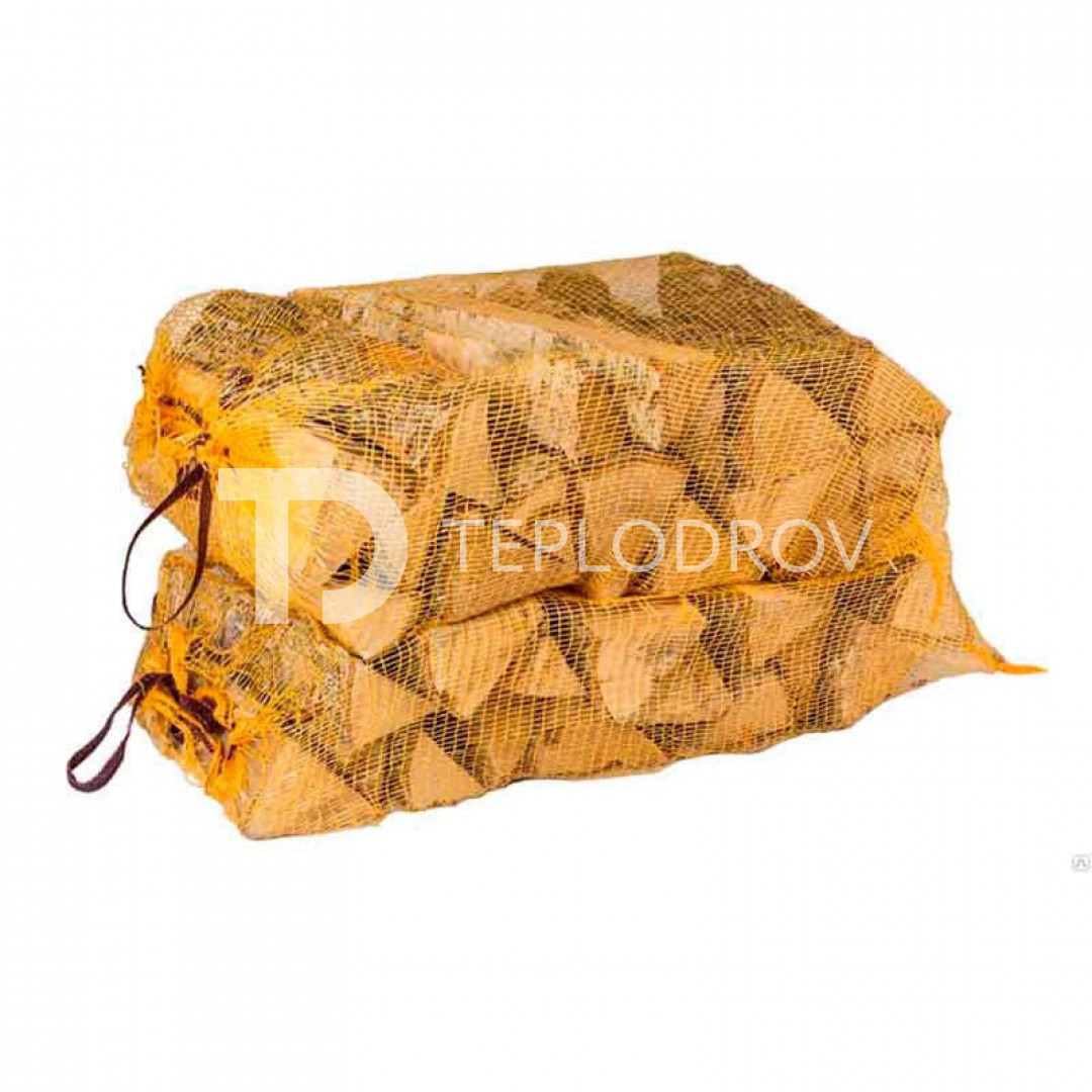 Сухие березовые колотые дрова в сетке.